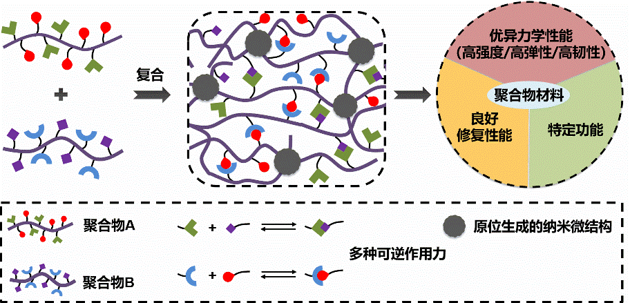 聚合物材料在使用过程中受到损伤,就会丧失原有的力学强度和功能。修复功能能够延长聚合物材料的使用寿命、减少原料浪费并提高材料的可靠性。赋予聚合物材料修复性能是可持续发展社会对聚合物材料设计的重要需求。两种或两种以上的聚合物基于非共价键相互作用或动态共价键能够生成聚合物复合物。聚合物复合物提供了一种简单且有效地制备自/可修复聚合物材料的方法。基于可逆超分子作用力及动态共价键,能够构筑各种类型的聚合物复合物,且聚合物复合物的组成、作用力类型和强度以及微结构高度可调,为调控基于聚合物复合物材料的力学性能及修复性能提供了基础。