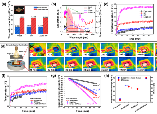 图3. (a) 天然木材、脱木素木材、木质素衍生碳量子点修饰脱木素木材沿各自横截面、纵截面的热导率。(b) 天然木材、脱木素木材、木质素衍生碳量子点修饰脱木素木材的紫外-可见吸光光谱(AM 1.5标准太阳能谱图为背景,380-780 nm的可见光范围由绿色虚线标注)。(c) 纯水、天然木材、脱木素木材、木质素衍生碳量子点修饰脱木素木材在一个自然光强度照射下的温升曲线。(d) 木质素衍生碳量子点修饰脱木素木材在模拟光源下用作太阳能蒸发体系的示意。(e) 木质素衍生碳量子点修饰脱木素木材太阳能蒸发体系的红外测温图,光热蒸发区域由虚线矩形标记。(f, g) 纯水、天然木材、脱木素木材、木质素衍生碳量子点修饰脱木素木材在一个自然光强度下(1 kW·m-2)的温升曲线与相对应的蒸发量变化曲线。(h) 纯水、天然木材、脱木素木材、木质素衍生碳量子点修饰脱木素木材的总蒸发量与光热蒸发效率对比。