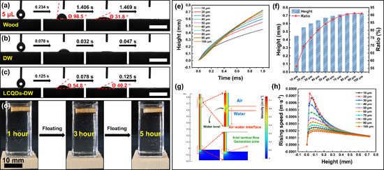 图4. (a, b, c) 天然木材、脱木素木材、木质素衍生碳量子点修饰脱木素木材的表面浸润性,测试面为样品横截面。(d) 木质素衍生碳量子点修饰脱木素木材在水中浸泡1/3/5小时后面的侧视图示意。(e) 模拟孔管内由毛细作用力驱动的水相提拔高度随时间变化的曲线,模拟孔管的半径以5 μm为增长单位由5 μm变化至50 μm。(f) 模拟孔管内水相最大提拔高度与相应气液界面在孔管内占比。(g) 模拟孔管内毛细力作用驱动水相输送过程示意。(h) 模拟孔管内沿孔管向上水相在不同半径孔管内的上升速度。