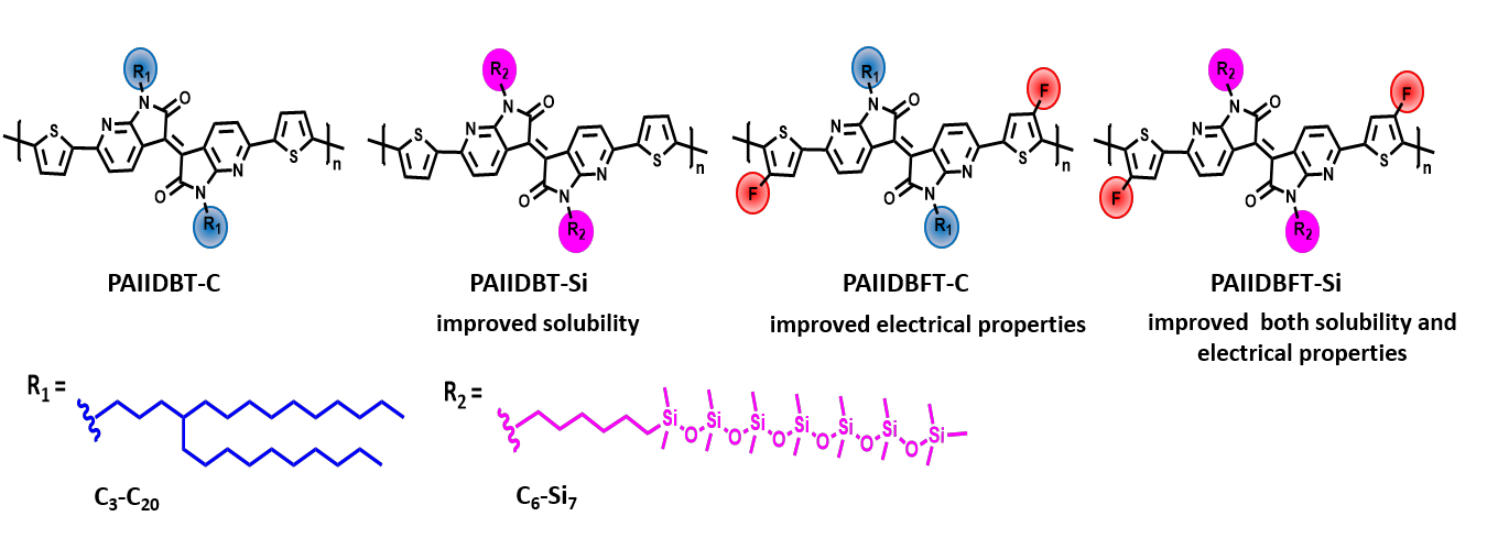 图一. PAIIDBT-C, PAIIDBT-Si, PAIIDBFT-C, PAIIDBFT-Si的化学结构式