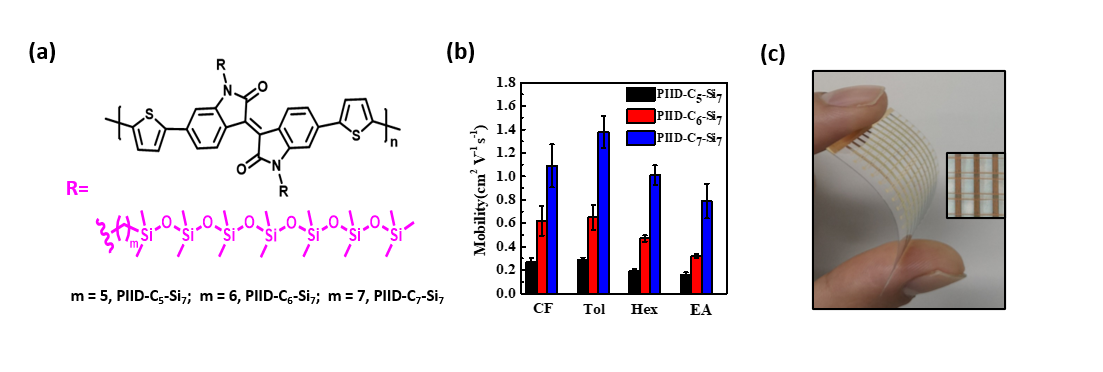 图三. (a) PIID-Cm-Si7 (m = 5–7)的化学结构式;(b) 不同溶剂加工的PIID-Cm-Si7 (m = 5–7) 基晶体管的载流子迁移率;(c) 基于PIID-C7-Si7的柔性晶体管阵列