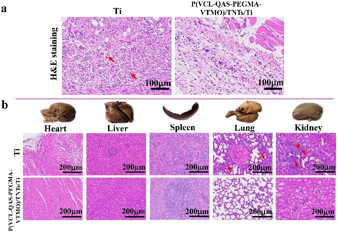 为了评价P(VCL-co-QAS-co-PEGMA-co-VTMO)/TNTs/Ti复合材料在生物材料领域的潜在应用,通过体外细胞实验和体内动物实验综合评估复合材料的生物安全性能(图5)。CCK-8试剂盒评估了该复合材料对小鼠胚胎成纤维细胞(NIH/3T3细胞)细胞活力的影响,证明了该复合材料具有良好的体外生物相容性。并进一步评价P(VCL-co-QAS-co-PEGMA-co-VTMO)/TNTs/Ti复合材料在促进细菌感染伤口愈合中的实际应用,采用苏木精-伊红(H&E)染色收集伤口组织的组织学图像,观察和评价感染伤口感染情况(图5a)。与原始钛板治疗后产生的大量免疫细胞、免疫因子并造成严重的组织坏死相比,复合材料处理的创面组织感染少,组织结构完整,说明其具有有效的抗伤口感染作用,且复合材料不会对大鼠的主要器官如心、肝、脾、肺和肾造成异常或损害(图5b),说明智能响应增强型抗细菌黏附材料P(VCL-co-QAS-co-PEGMA-co-VTMO)/TNTs/Ti不仅在化工工业、海洋船舶防腐防污、给水工程、材料工程,且在生物医学材料领域都具有较大的经济价值和应用前景。