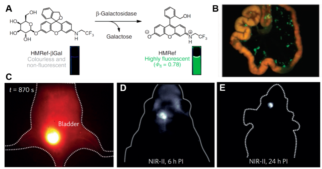 图3.(A)HMRef-βGal的化学结构及HMRef-βGal 的酶激活过程。(B)HMRef-βGal 用于癌症转移成像。CH1055-PEG用于(C)小鼠膀胱NIR-II成像(D)4 mm深度处小鼠脑肿瘤成像及(E)全身成像。