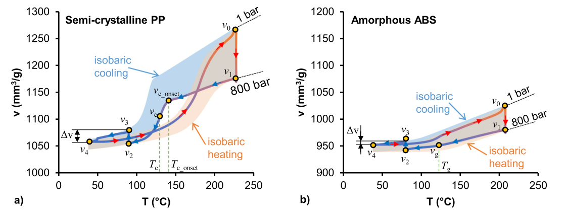 注射成型被广泛用于快速批量成型具有复杂形状的塑料制品。为了制造出高质量的制品,注射成型过程需要最佳的工艺条件和高的复现性。聚合物的比容(比体积,v,密度的倒数)是由压力(p)和温度(T)等变量决定的,是预测塑料制品体积、形状和尺寸的重要指标。聚合物的压力-比容-温度(pvT)关系被广泛应用于注射成型过程的数值模拟和过程控制中,以获取最佳工艺条件,提高制品成型精度。