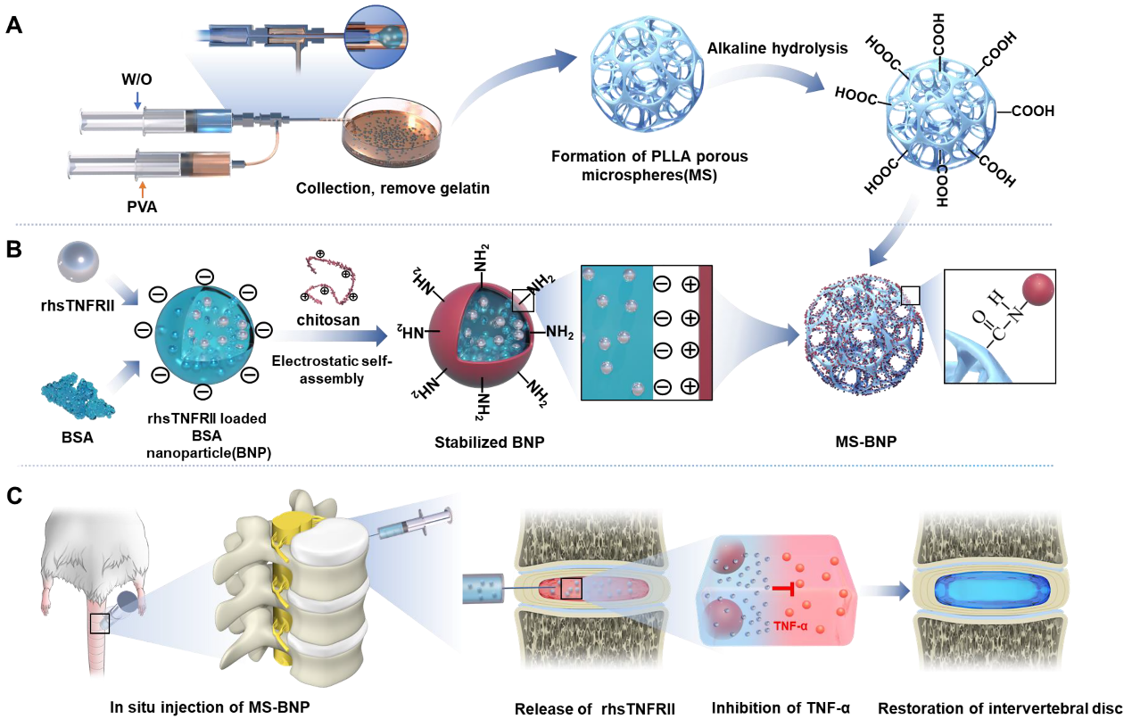 拮抗剂能够有效结合炎症因子发挥纠正ECM紊乱的作用,但较短的半衰期抑制其进一步临床应用。白蛋白分子中具有多重药物结合位点,能够有效维持蛋白类药物活性,延长药物在体内的作用时间。因此在本研究中, 牛血清白蛋白(BSA)纳米粒(BNP)被用于拮抗剂的包裹。由于椎间盘内较大的压力,直接注射载药纳米粒会出现渗漏等问题。此外,目前已有的生物材料支架常通过物理方法负载药物,无论是负载效率还是纳米粒的均匀分散都无法令人满意;而且椎间盘狭小的空间限制了微创注射进入其中的材料体积,物理负载难以保证单位体积药物浓度。针对上述问题,联合团队借助微流控装置利用乳液法制备平均粒径约100um的PLLA多孔微球(MS),其表面及内部含形状规则、内外互通的孔隙,不仅能够提升负载效率,也有利于拮抗剂内外同步释放。同时,研究人员运用碳二亚胺法,将载药纳米粒与微球通过酰胺键相连,成功构建负载拮抗剂的可注射多孔微球(MS-BNP)。微创注射至病灶部位,调节ECM代谢平衡。
