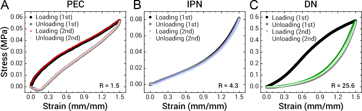 图5.循环测试以测量滞后现象和可恢复性。(A-C)使用1.5的应变对(A)PEC,(B)IPN和(C)