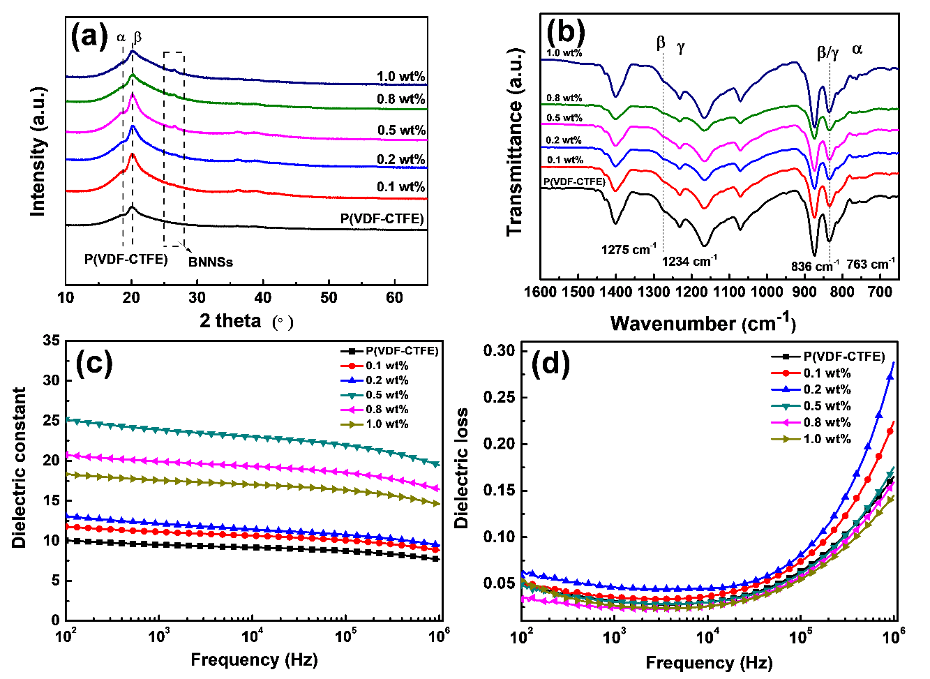 图3. BNNS/P(VDF-CTFE)纳米复合薄膜的表征: (a) XRD; (b) FTIR; (c)介电常数; (d)介电损耗
