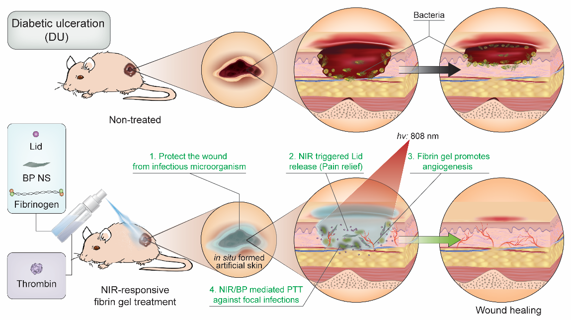 这种功能化凝胶主要包含:(1) FDA批准的具有良好的生物相容性,适合简单的喷涂,以及通过促进血管生成来愈合伤口等优点的纤维蛋白原和凝血酶; (2) 易于降解为无毒磷酸盐离子的光热剂BP纳米片; (3) FDA批准的麻醉药盐酸利多卡因。这种工程化的黑磷基凝胶喷涂后可以作为类似于人工“皮肤”的存在,不仅可以临时保护伤口组织与外部环境的接触、促进内皮细胞增殖和血管化。同时,也可以作为一种药物的“储存库”,并且可以通过近红外激光激活产生局部热量加速微血管中血液流动、按需触发释放盐酸利多卡因缓解疼痛,以及通过光热治疗消除细菌和减少炎症。