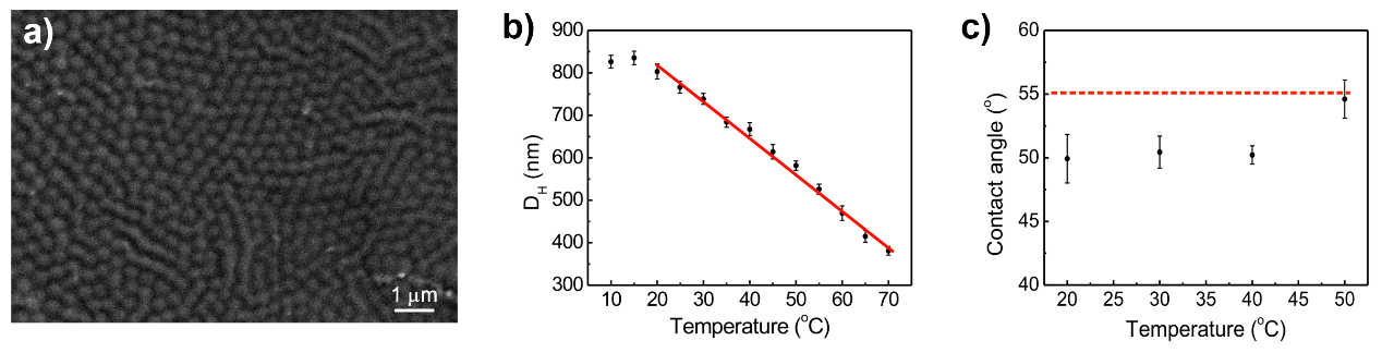 图1:(a)P(MEO2MA-co-OEGMA300-co-EGMA)温敏微凝胶的SEM图;(b)微凝胶在升温过程中的粒径线性变化;(c)微凝胶在20-50 ℃范围内的接触角变化。