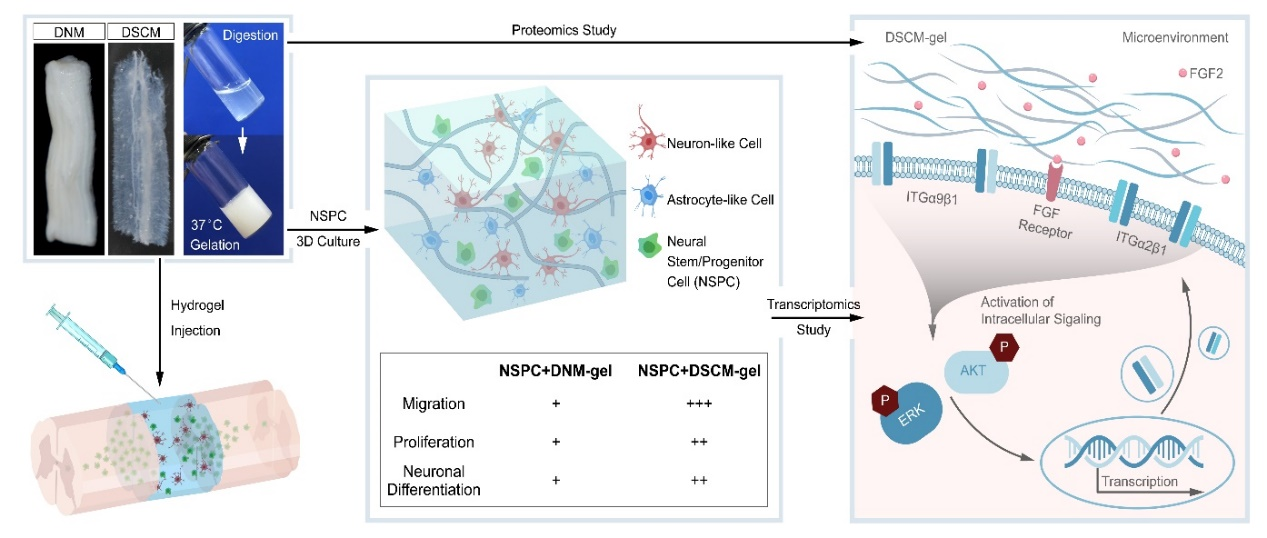 图3. 脱细胞脊髓基质水凝胶的制备及其有效促进神经干细胞增殖、分化和神经元向分化的潜在机制分析。