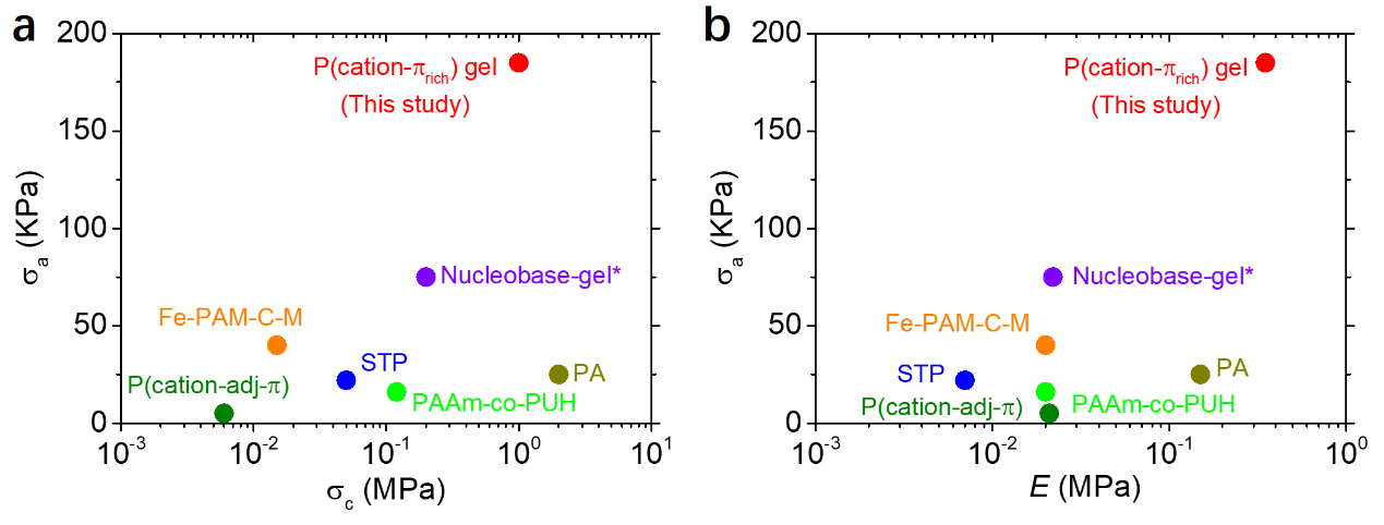 开发出可以在水下各种表面上实现牢固且可重复使用的胶粘剂是一个巨大的挑战,因为水分子会极大的削弱界面分子之间的相互作用。通常来讲,可重复且牢固的粘合既需要界面处的强非共价相互作用,又需要主体材料高韧性(图1a)。具体来讲,理想的粘合剂材料需要拥有较大的断裂应力(σc),断裂应变(εc),以及高于屈服应力(σy)的界面结合强度(σa),从而确保材料在剥离过程中可以经受大的变形以耗散大量能量。将该原理应用于水凝胶粘合剂时,水凝胶需要在溶胀平衡状态下仍保持可拉伸性和韧性从而保证其在脱粘过程中不发生材料本体断裂。与此同时,水凝胶应具有破坏界面水合层并与基底表面形成强物理相互作用的能力。水凝胶的增韧可以通过引入大量的可逆动态键来实现。然而,人们对于在水中获得强的非共价界面相互作用力的分子设计原理知之甚少。研究发现,贻贝足蛋白中的邻苯二酚基团在酸性条件下可以与多种基底形成强相互作用,但在现实条件下邻苯二酚很容易被氧化而失去附着力。在水中,许多固体表面,例如岩石,玻璃和金属,都带有负电荷。因此,静电相互作用可以为水下粘合剂的制备提供一种新的思路。然而,由于离解的抗衡离子具有很高的离子渗透压,含有离子基团的水凝胶在水中会发生剧烈的溶胀。因此,聚电解质水凝胶在水中易碎并且机械上很弱。尽管高强度水凝胶和强粘附性聚合物都已有研究报道,但是将它们组合到一个水凝胶中仍然具有挑战性。