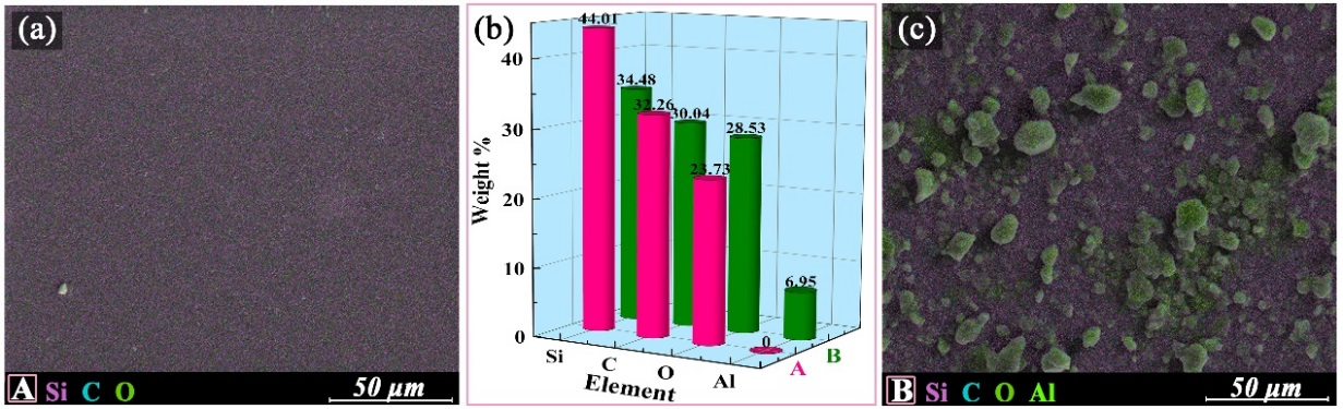 图2 原始硅橡胶(A)和氧化铝/硅橡胶(B)表面的元素分布及含量图