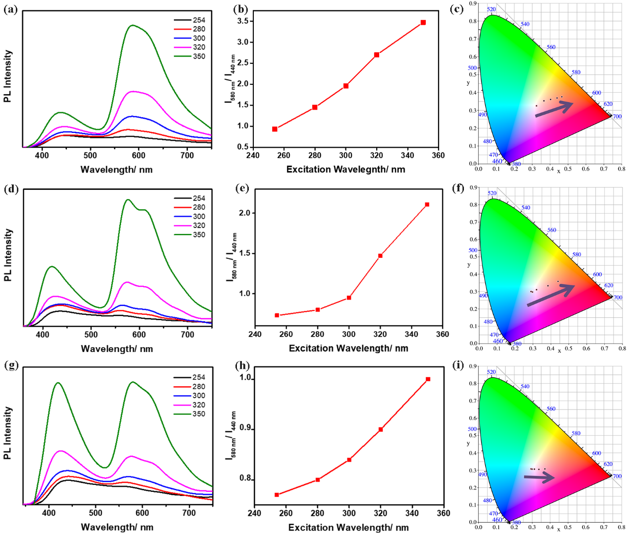 图2 P1(a)、P2(d)和P3(g)在不同激发波长下的光致发光光谱;P1(b)、P2(e)和P3(h)在580 nm和440 nm处的相对发射强度与激发波长的关系。根据光谱图计算得到的P1(c)、P2(f)和P3(i)的CIE 1931坐标图。