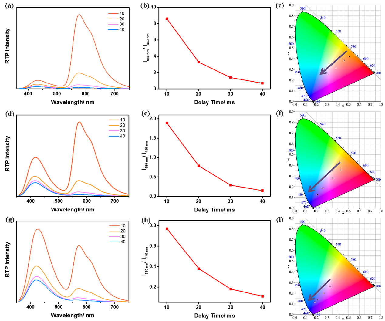 图3 P1(a)、P2(d)和P3(g)在不同延迟时间下测得的磷光发射光谱;P1(b)、P2(e)和P3(h)在580 nm和440 nm处的相对发射强度与延迟时间的关系。根据光谱图计算得到的P1(c)、P2(f)和P3(i)的1931 CIE坐标图。