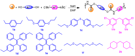 图1. 用单质硫和二醇、二异腈化合物合成聚[硫羰甲氨酯]的示意图.