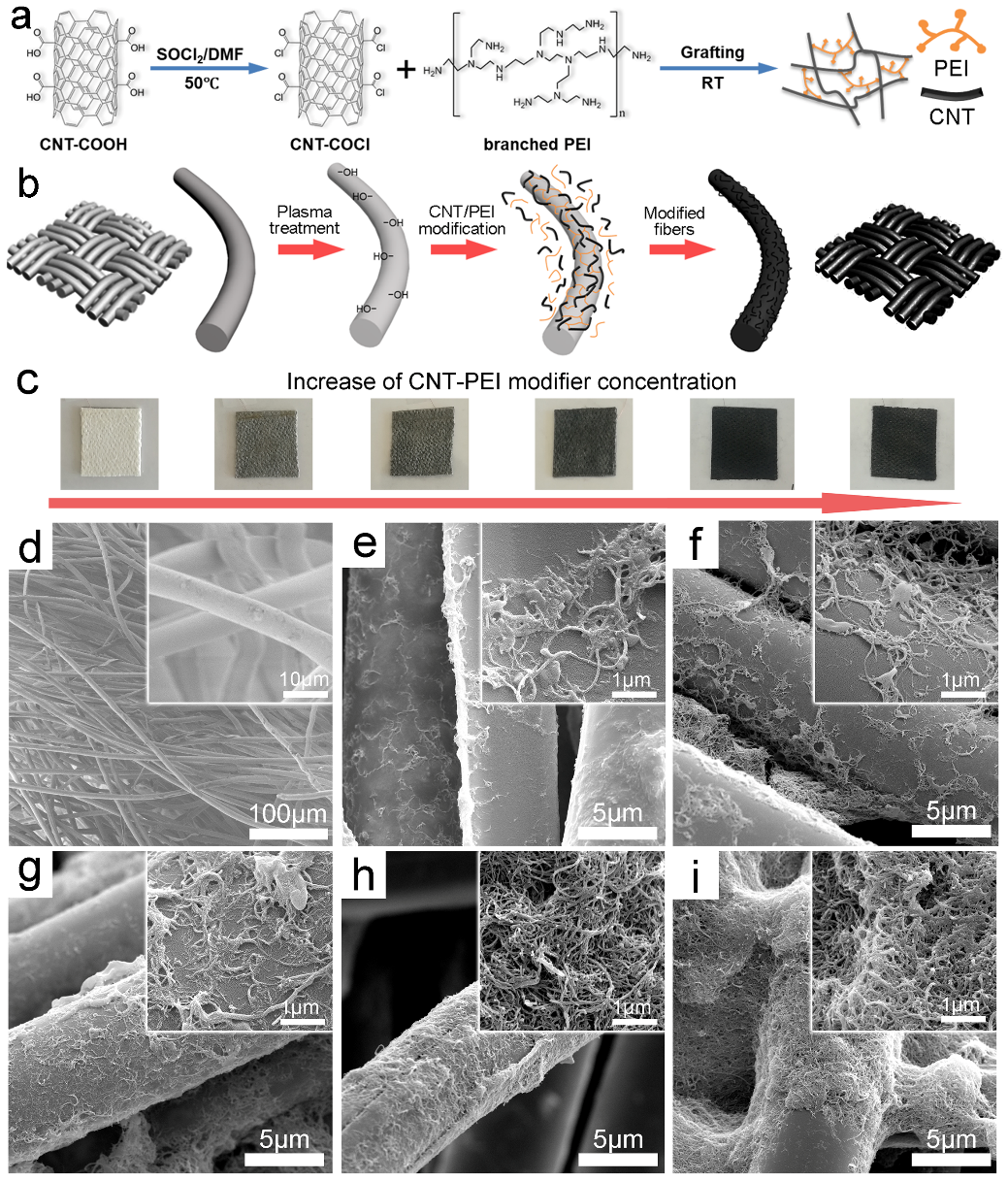 鉴于此,湖南工业大学经鑫教授课题组提出了一种普适简易的改性方法,通过碳纳米管(CNT)和聚乙烯亚胺(PEI)的接枝实现了商用天鹅绒织物摩擦电性能的显著提升。通过在织物表面引入碳纳米管和酰胺键,一方面构筑了微纳层级结构,另一方面提升了织物的正电性,使织物具备更高的电荷密度和摩擦纳米发电性能。