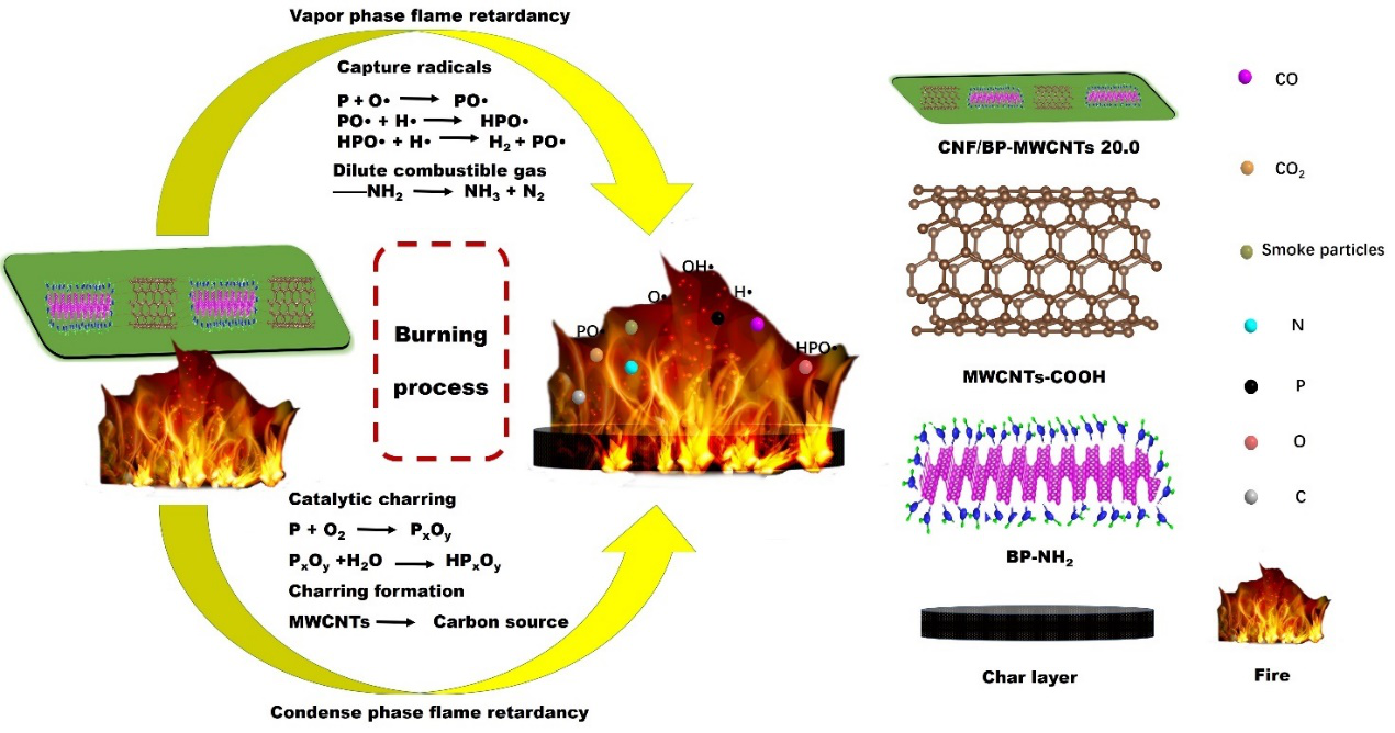 最后,研究人员结合TGA、EDS、XRD、Raman、XPS等多项表征手段对炭层进行了分析,并提出一种包含气相阻燃和凝聚相阻燃的双重阻燃机理(图7)。其中,气相阻燃机理认为BP在高温下裂解生成P?,它将捕获气相中的自由基(如H?和OH?自由基),降低可燃物的含量,进而阻碍燃烧行为的进行。同时,氨基将变成不可燃气体(如氨气和氮气),稀释可燃气体的浓度并进一步抑制燃烧行为。凝相阻燃机理认为MWCNTs的加入为复合膜体系提供了充足的碳源,促进了保护性炭层的形成。此外,BP与氧气反应形成磷氧化物,这些磷氧化物在水的作用下会进一步转变为磷酸衍生物(如H3PO4、H3PO3、HPO3和HPO2等),将再次促进致密炭层的生成,有效隔绝了热量和可燃气体的渗透,进而达到阻燃的目的。