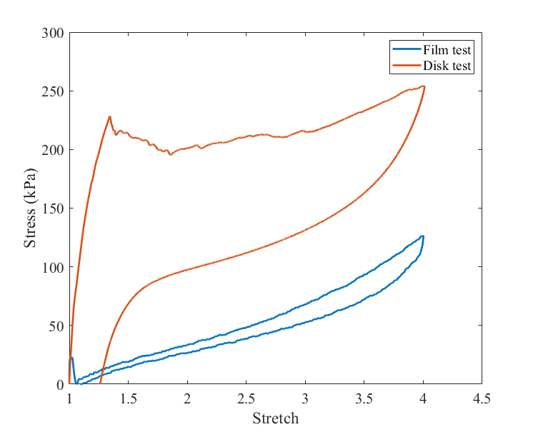 从双轴应力转变为三轴应力,硅橡胶可承受的应力会增加。这是可能是由于三轴应力可以在材料内部产生大量的损伤。为验证这一假设,研究人员进一步对薄膜试件和盘状试件进行了单轴的加卸载测试。两个试件都被拉伸到原长的4倍,然后卸载到位移为零 (图3)。对于薄膜试件,滞回百分比为22%;对于盘状试件,滞回百分比为46%。盘状试件中的应力比薄膜试件中的应力高。在盘状试件中,研究人员没有观察到所谓的空化现象。