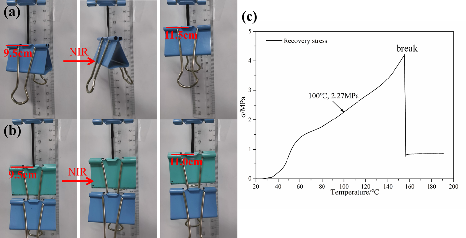 在光响应性的基础上,形状记忆聚合物的多段响应性能够增加材料形状变化的设计性及复杂性,从而进一步拓展材料的应用前景。在该研究中所采用的乙烯-乙烯醇共聚物,兼具有聚乙烯醇及聚乙烯的转变温度,因此具备了实现三段形状记忆性能的结构基础。如图2所示,通过动态热机械分析仪的热力学循环表征,复合材料的确能够实现优异的热致三段形状记忆性能。而通过调控近红外光源的功率密度,研究发现该复合材料还能够实现光致三段形状记忆行为。此外,课题还进一步研究了该复合材料在光致驱动器中应用,结果发现该材料能够拉动自身重量1600倍的负重,使得该材料在光驱动器件中有着广泛的应用前景。