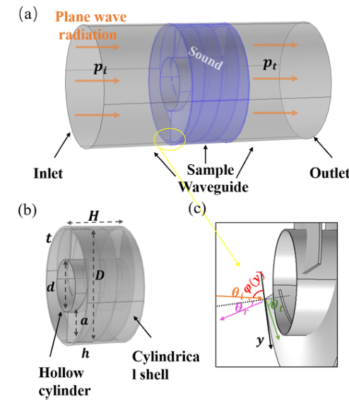 图2所示为螺旋吸声器的模型。(a)将螺旋单元置于波导中;(b)螺旋装置的内部结构;(c)声波在螺旋单元入口处的波传输行为反/折射示意图。