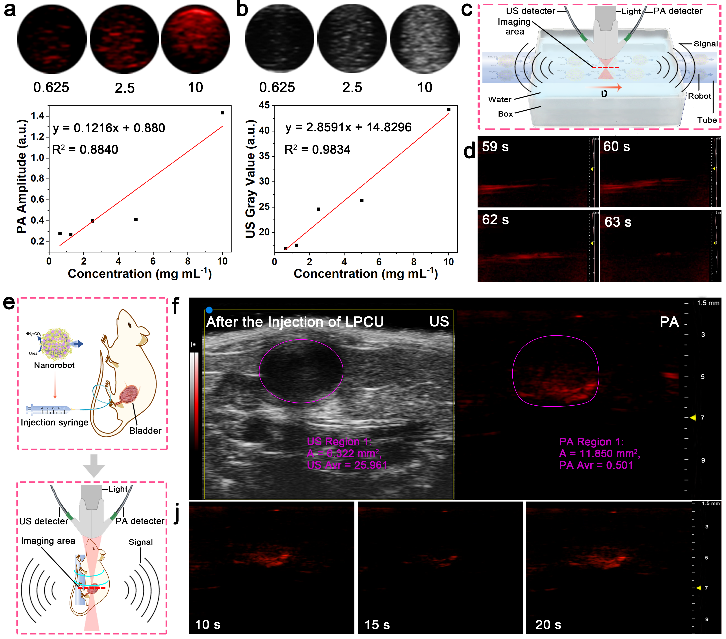 该团队使用聚多巴胺(PDA)来稳定纳米尺寸LM作为LM纳米马达的基底。PDA覆盖层允许通过静电吸附进行头孢克肟(CF,一种典型的抗生素)负载,同时通过戊二醛作为连接剂的脲酶。通过脲酶触发尿素的生物催化分解,纳米马达载体不仅可以实现增强扩散以促进CF的输送,还可以实现趋化运动以实现在芯片上靶向输送。另外,由于LM具有独特的变形能力,球形的LM MNMs在近红外光照射下可以转化为具有较高光热转换效率的米状LM。LM MNMs的形态变化导致其功能从主动式的药物载体转变为光热剂,从而实现药物协同光热抗菌治疗。利用LM的固有特性,展示了LM的超声和光声成像能力,进而实现了利用双模态医学成像技术跟踪LM MNMs在微流控容器模型中的运动。此外,通过LM MNMs可视化的运动行为对雌性小鼠的膀胱进行了活体生物成像。该主动式LM纳米平台为开发以协同治疗和诊断的体内目的可跟踪MNMs提供了新的视角,并将进一步推动自驱动生物医学MNMs的临床应用。