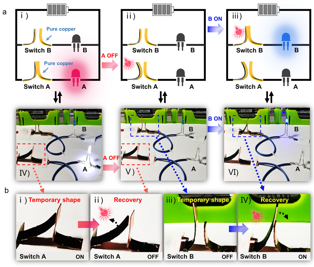 图6. 近红外光控智能形状记忆开关的构筑。a) 卡通示意(上)及实验(下)展示含智能开关的并联电路。ⅰ) 处于临时形状的 Switch A (light ON) 与B (light OFF); ⅱ) NIR照射后A开关的形状记忆恢复 (light OFF); ⅲ) NIR照射后B开关的形状记忆恢复(light ON). b) PUOU-73开关的工作细节,ⅰ) Switch A ON; ⅱ) Switch A OFF; ⅲ) Switch B OFF; Ⅳ) Switch B ON.