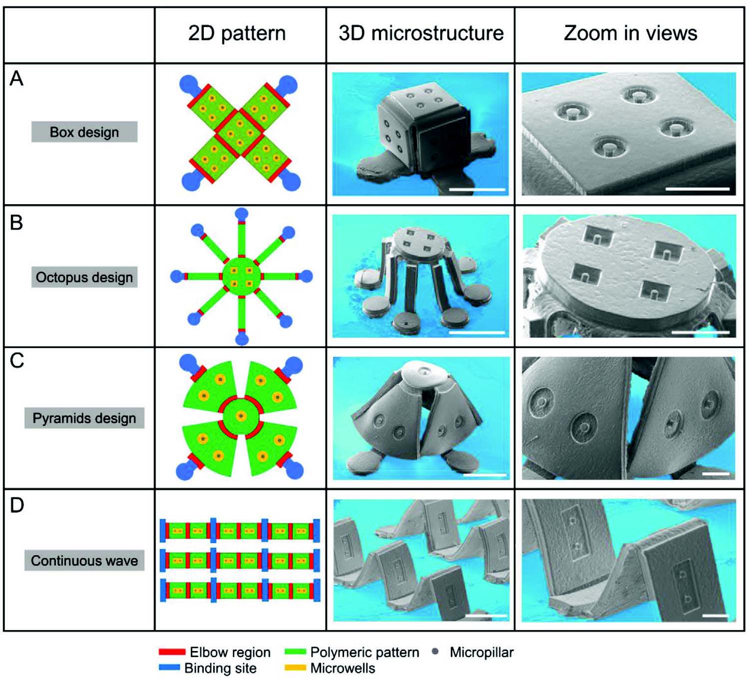 在这项新研究中,研究人员利用压缩屈曲原理,从微制作的平面图形中创建三维仿生显微组织。研究人员筛选出了韧性及生物相容性良好的聚合物材料(此研究中使用了PLCL和PCL),并使用了例如用糖作为牺牲材料释放平面结构和微接触印刷等技术,把通过传统微加工方式形成的高精度的平面结构准确快捷的转化为三维立体形状。为了证明这一原理,研究人员制作了如盒子,八爪鱼,金字塔和波浪等形状的显微组织。最后,研究人员将此技术应用于形成血管化的矿化骨组织模型,其中包含有空间分布的细胞负载的骨陷窝结构。这种新的方法将有助于显著扩大现有的二维制造技术在三维组织制造中的应用,填补了二维和三维组织制造之间的空白,为组织工程和再生医学开辟新的可能性。