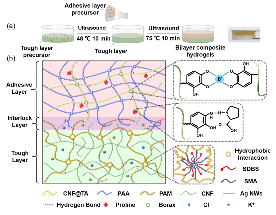 随着人工智能的快速发展,对能够模拟人体器官功能的仿生电子设备的需求日益增加。其中,可将压力、温度和湿度等外部刺激转化为电信号的水凝胶柔性传感器是目前研究的热点。然而,水凝胶较差的拉伸性和粘附性严重限制了其在可穿戴电子器件中的应用;此外,良好生物相容性使其作为伤口敷料在继发性损伤、组织液渗漏、伤口感染和溃疡等方面的应用也受到广泛关注。