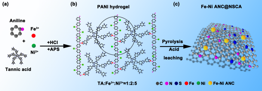 图1. Fe-Ni合金纳米团簇作为活性位点的N,S共掺杂多孔碳气凝胶催化剂(命名为Fe-Ni ANC@NSCA催化剂)的制备流程示意图。