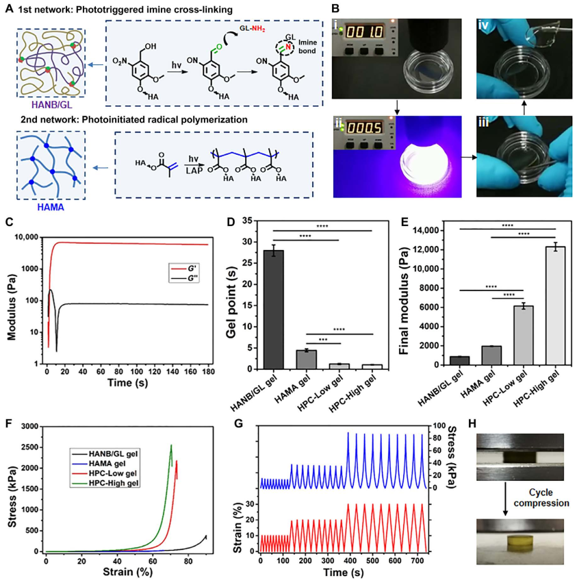 图1. 杂化光交联水凝胶的构建示意图及理化性质表征