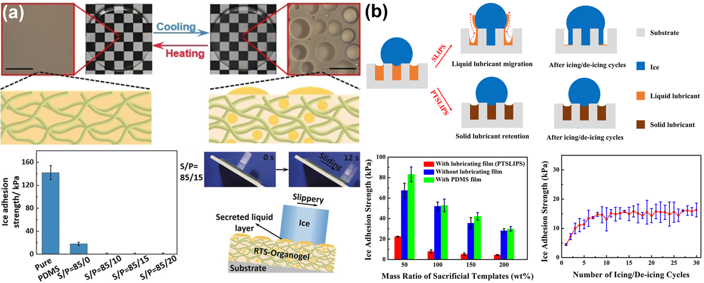 图2. 通过设计环境响应的基底得到的动态防覆冰表面 (a) 热响应的润滑液可再生的有机凝胶 (b) 可相变的润滑液浸润的多孔表面。参考https://doi.org/10.1002/anie.202004122和https://doi.org/10.1016/j.cej.2018.11.224。