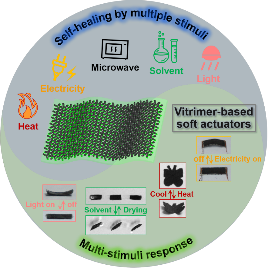 近日,清华大学核研院杨洋博士和清华大学化学系吉岩副教授、张莹莹副教授制备了基于环氧树脂类玻璃高分子(vitrimer)和碳化蚕丝的柔性驱动器,该柔性驱动器不仅对4种刺激(光、热、电、溶剂)具有响应性,同时可用5种刺激(光、热、电、电磁波、溶剂)进行自愈合/自修复,实现了柔性驱动器同时具有多重响应性和多重愈合的性能,有望使柔性驱动器和复合材料在工业上有更广泛的应用。