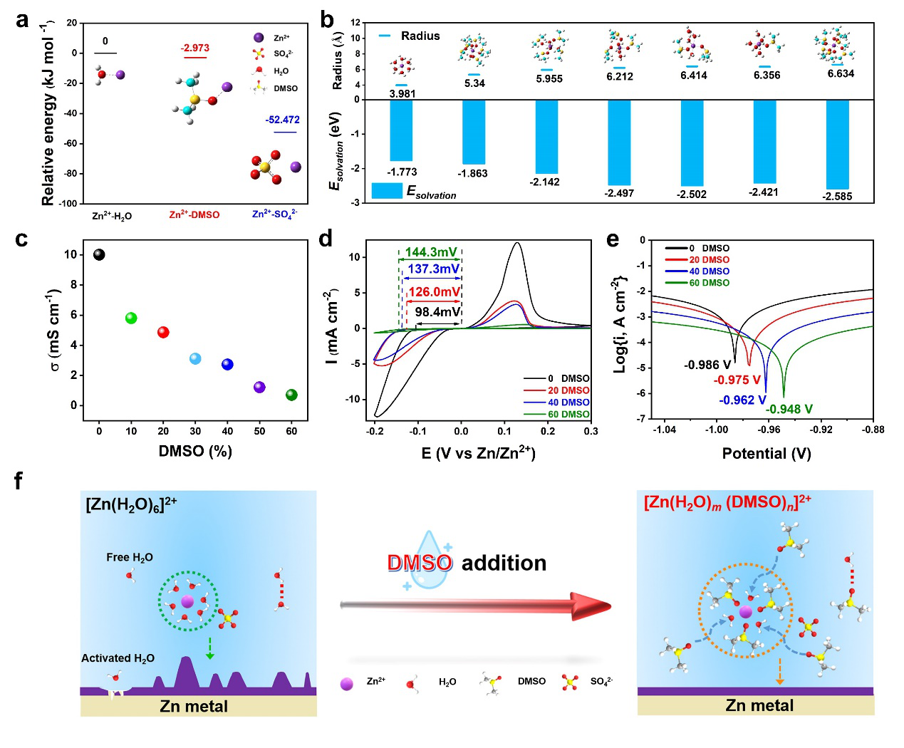 图3. DMSO混合电解质中重构的Zn2+的溶剂化结构及离子电导率、成核过电位、腐蚀电位和沉积动力学示意图。