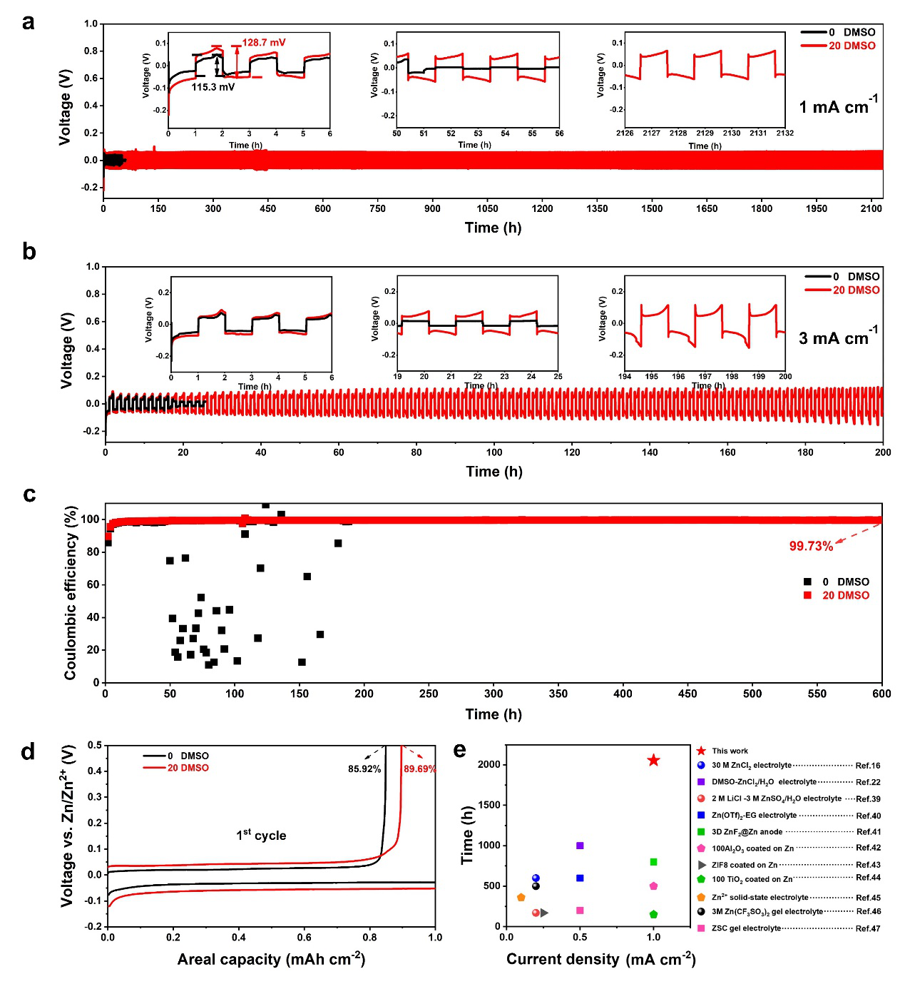 图4. 20℃下DMSO混合电解质电池的电镀/剥离行为。