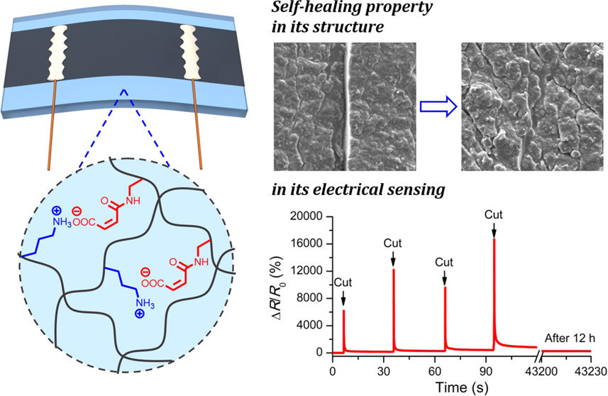 最近,基于前期对不饱和羧基-氨基离子相互作用的研究,华南理工大学张安强教授课题组研究设计并组装了一种自修复、自粘性的CNT/聚硅氧烷应变传感器:通过改变[-COOH]/[-NH2]的比例,聚硅氧烷的粘弹性、力学性能及自愈合性能得到有效调控,在此基础上,将羧基化CNT与聚硅氧烷基底复合制备双层结构复合膜。他们发现,CNT膜的厚度对传感器的敏感度因子(Gauge Factor)和线性度有明显影响。该应变传感器具有自愈能力、自粘性、高灵敏度、线性响应和低滞后等特性。