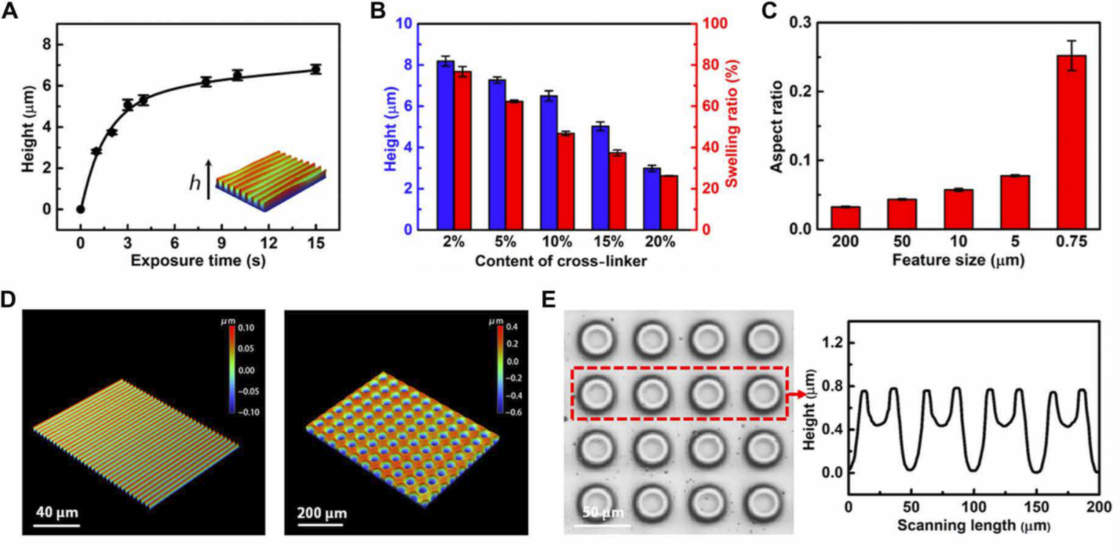 图3. 光照时间(A), 交联剂含量(B), 对所得到微结构尺寸的影响. (C)所构筑结构宽度对最终生成结构的高宽比的影响. (D)(E)所得到的各类表面微结构