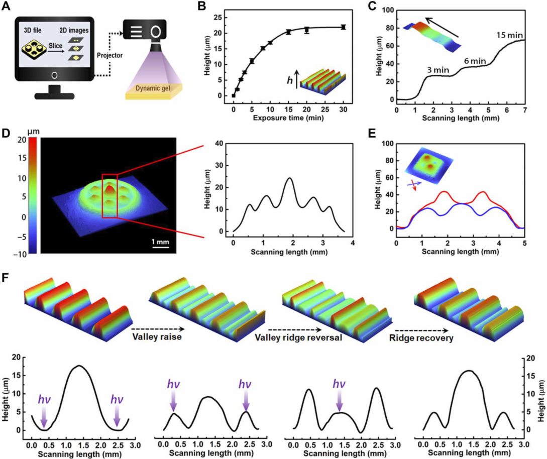 图4. (A)数字化掩膜过程, (B)光照时间的影响, (C)阶梯状结构, (D)山脉状结构, (E)既有凸起又有凹陷的立方体结构, (F)凝胶表面结构的动态调控