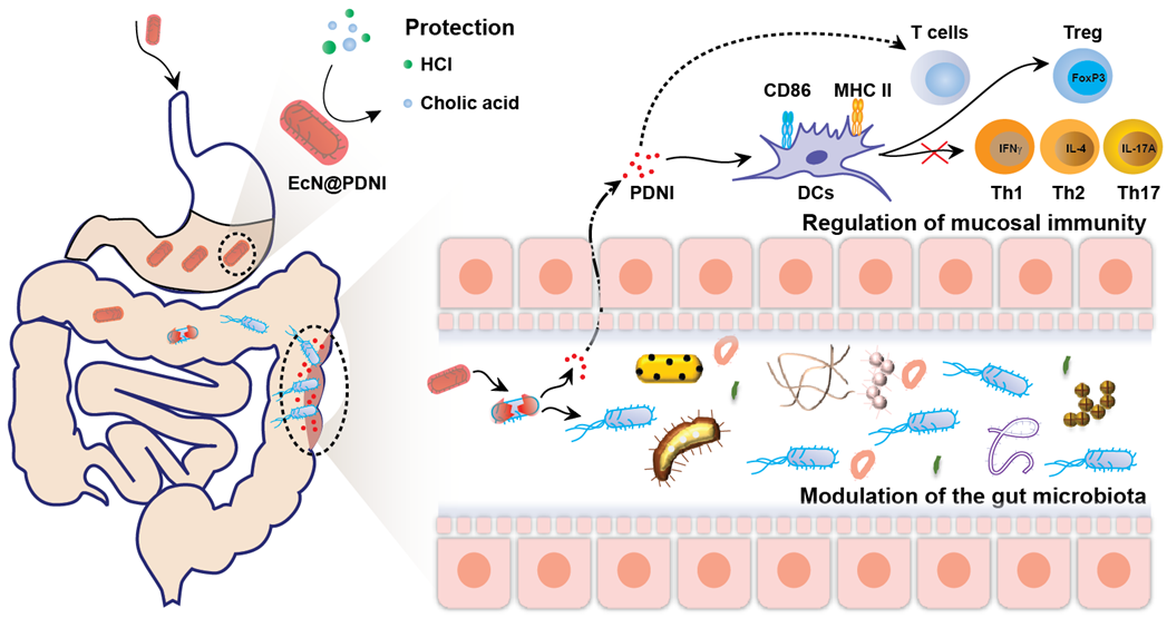 多巴胺,作为一种神经递质,通过结合免疫细胞上的多巴胺受体而发挥免疫调节的作用。多巴胺可以影响效应T淋巴细胞的激活以及相关细胞因子的分泌。另外,多巴胺还能够对肠道中的免疫反应进行调控进而维持肠道稳态。研究报道,低剂量多巴胺能促进辅助型T(T helper,Th)细胞的增殖,从而促进炎症反应。增加肠道中多巴胺的水平,可以有效维护肠道稳态,并促进肠道炎症的恢复。基于此,上海交通大学分子研究院刘尽尧课题组通过多巴胺自聚形成聚多巴胺纳米免疫抑制剂(PDNI),并发现PDNI与多巴胺类似,具有参与多巴胺系统及调节免疫反应的能力,可用于免疫调控和治疗。将PDNI涂层至肠道益生菌表面,可有机结合PDNI的免疫抑制和益生菌的肠道菌群调控能力,发展一种基于涂层细菌的肠道免疫与菌群调控策略。其中,PDNI可以激活Treg细胞,并抑制Th细胞,包括Th1,Th2和Th17细胞。同时,PDNI还能抑制DC的激活,而DC的激活可进一步上调Treg/Th17比例。在局部炎症组织中,PDNI能有效抑制过激的免疫反应,并有助于炎症反应的逆转。除此之外,PDNI还可提供保护作用,防止细菌在口服后受到胃酸和胆汁酸等的破坏。PDNI涂层细菌不仅抑制过度活跃的免疫反应,还积极调节与结肠炎小鼠的肠道微生物组。与氨基水杨酸和未涂层益生菌相比,在两种小动物结肠炎模型中,多巴胺免疫调节和肠道菌群调控相结合的方法展示出更显著的治疗效果。