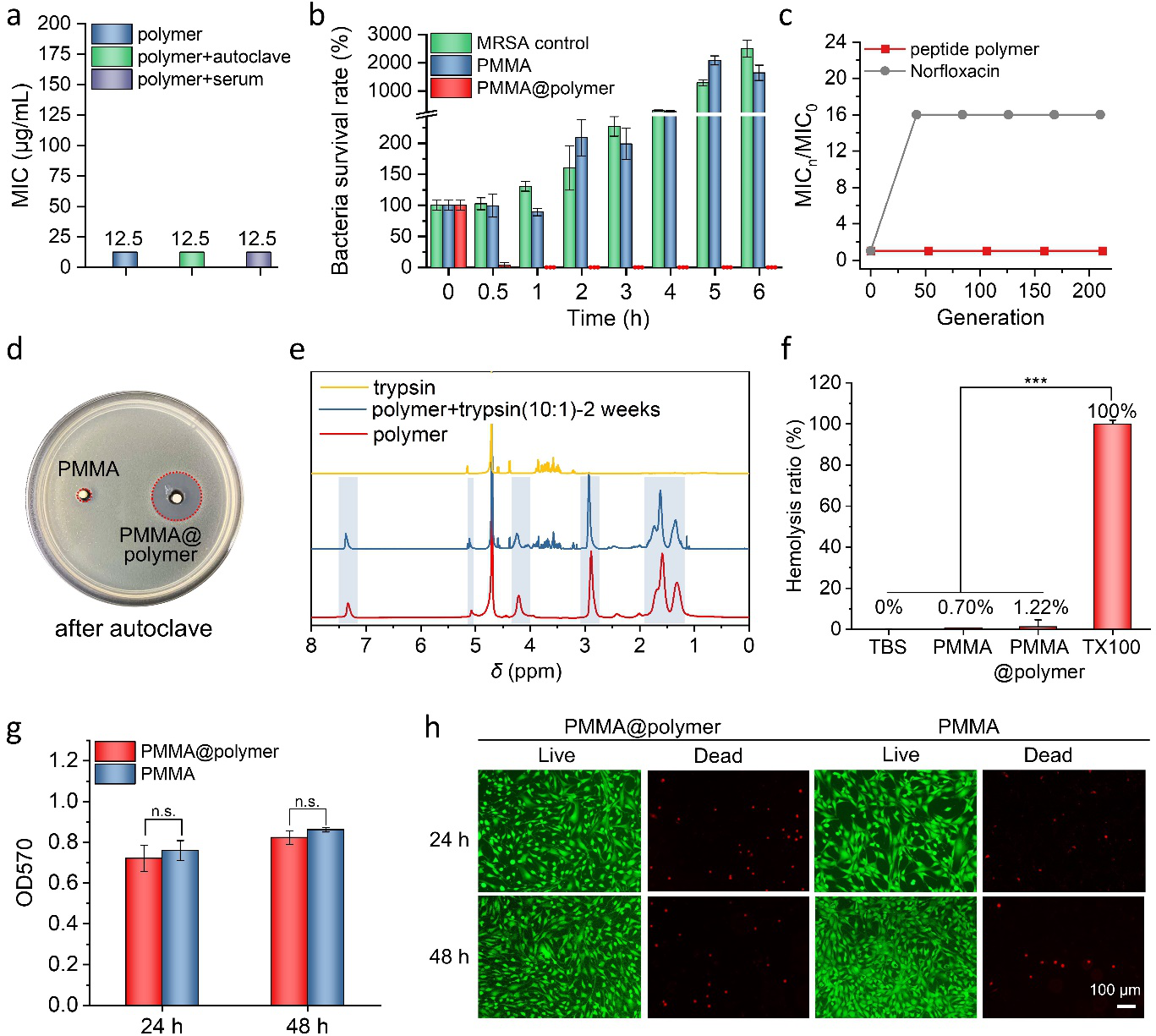 多肽聚合物作为宿主防御肽 (HDPs) 的模拟物,不仅具有高效抗菌活性,能在1小时内杀死99.99%的细菌,还不易诱导细菌产生耐药性。在本研究中连续使用多肽聚合物刺激超过200代的细菌未获得耐药性。值得注意的是,多肽聚合物还能有效地杀死MRSA持留细菌,与最后一线抗生素万古霉素的低活性形成鲜明对比。此外,抗菌骨水泥微球还具有可以忽略的溶血毒性和较低的细胞毒性。特别的是,含有外消旋D,L赖氨酸组成的多肽聚合物展示了良好的酶稳定性及热稳定性,高浓度胰蛋白酶处理两周后未观察到明显多肽聚合物降解,能在高压灭菌后成功保持其原始抗菌活性 (图3)。借助多肽聚合物在生理环境中稳定性高的突出优势,本研究中抗菌PMMA骨水泥设计策略与抗生素掺杂有很大不同:他们设计快速释放抗菌多肽聚合物、快速起效且效果持续时间长,同时实现基本完全释放。