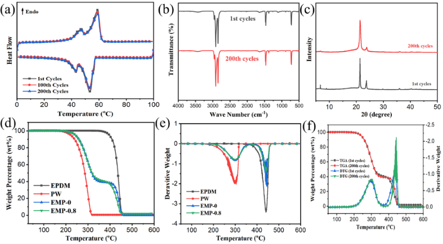 1)利用水辅助的熔融共混技术规模化制备了柔性的高性能EPDM/MXene/PW复合相变材料。