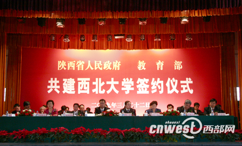 教育部与陕西省人民政府今天在西安签署共建西北大学协议书。教育部部长周济和陕西省省长袁纯清在共建协议上签字并讲话。陕西省委书记赵乐际出席,陕西省委副书记、教工委书记王侠宣读共建协议书。签约仪式由陕西省副省长朱静芝主持。