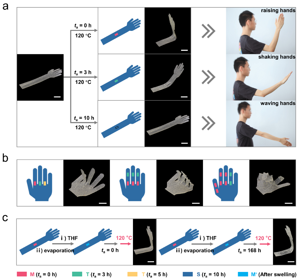 利用不同晶相的熔点和形状记忆行为的差异,进一步实现了形状信息和动作信息动态演变和调控。对于区域化写入亚稳态晶相的样品,晶相转变的发生使材料的形状回复能力越弱,材料的变形能力和动作信息呈现随时间自主演变的特性(图4a)。通过调控不同区域的晶相转变时间,可获得“类生命体”的多样化的动作展示(图4b)。同样,通过溶剂处理(溶液结晶)阻断材料的晶相转变,可实现形状信息的永久保留和重现(图4c)。