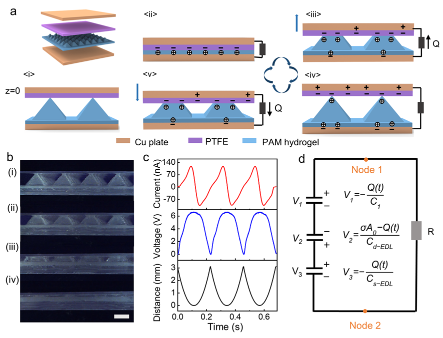 图1. 水凝胶-介电聚合物界面处动态双电层发电。