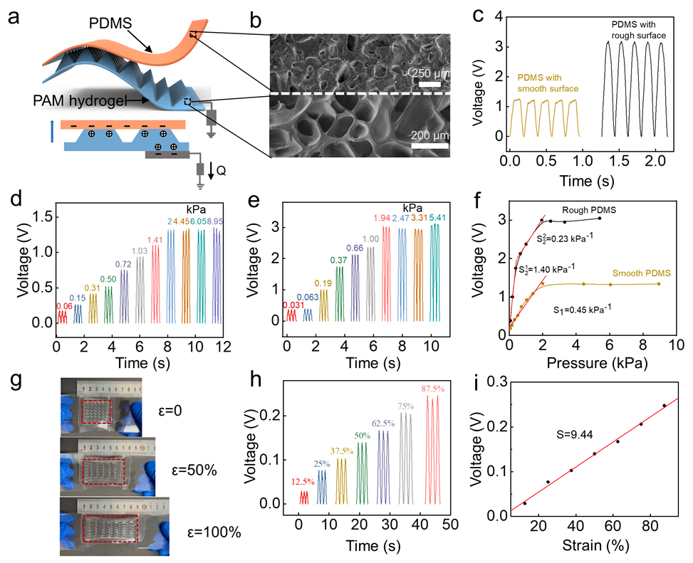 近来,中科院纳米能源所蒲雄研究员和王中林院士课题组设计并制备了基于水凝胶-介电聚合物间动态界面的发电器件,实现了机械-电能的转换,并基于此构建了用于监测人体运动的自驱动柔性力敏传感器。该器件工作原理为:首先,水凝胶与介电聚合物之间的接触起电可以使介电聚合物表面带电,并在水凝胶与介电聚合物间界面形成双电层;然后,金字塔形水凝胶的周期性机械变形导致双电层面积和电容的周期性变化,从而在外部电路中感应出交流电(图1a)。该工作认为水凝胶-介电聚合物界面的双电层是通过界面接触起电和异号电荷静电吸引两步形成的,而界面的接触起电是主要基于水分子与介电聚合物间的电子转移(图2)。利用这种基于动态双电层的机电转换机制,该工作构建了可拉伸的自驱动压力传感器(图3)。进一步地,通过增加介电弹性体聚合物的表面粗糙度,提高了传感灵敏度,在 31-300 Pa 的低应力范围内,灵敏度可以达到 1.40 kPa-1;最后,该工作示意了利用此传感器检测人体机械运动和生理信号(图4)。这种机电能量转换器件和相应的自驱动传感器有望广泛应用于未来的柔性电子器件。该工作以“Electricity Generation and Self-Powered Sensing Enabled by Dynamic Electric Double Layer at Hydrogel-Dielectric Elastomer Interfaces” 为题发表在《ACS Nano》上。文章的第一作者是中科院纳米能源所硕士生贾璐瑶。该研究得到国家自然科学基金委的支持。