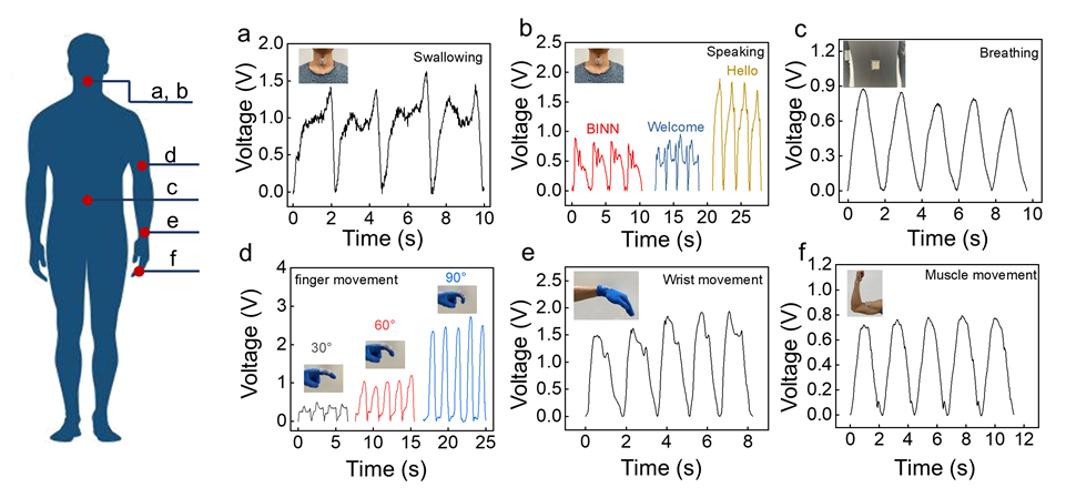 图4. 自驱动传感器检测微小的人体运动。