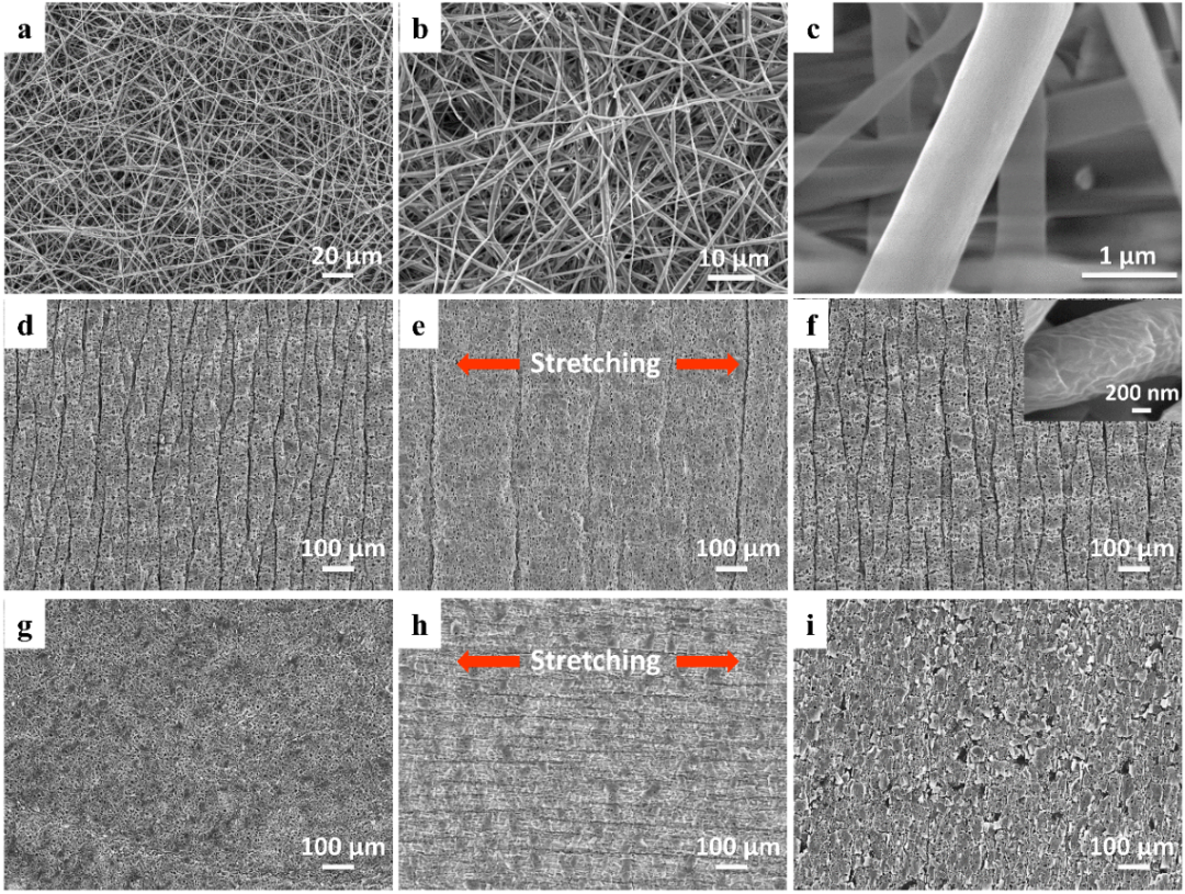 图3(a-c)不同放大倍数下TPU纳米纤维膜表面形态的SEM图像,(d-f)具有褶皱结构的TPU/MXene织物在动态拉伸过程中的表面形态变化,(g-i)动态拉伸过程中平面TPU/MXene织物表面形态的变化。