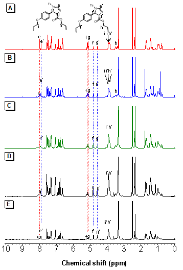 图2 不同作用时间下三乙胺处理的P1a2a在DMSO-d6的核磁氢谱图:(A)0,(B)0.5,(C)1,(D)2,(E)3 h。