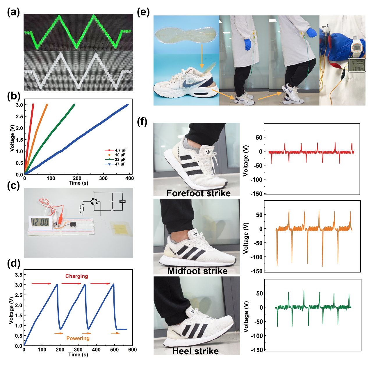 具有诸多优良性能的SI-TENG在日常生活中也有很好的实际应用,它可以同时点亮80个绿色发光二极管、为电容和电子表等电子元器件充电(图.4a-e)。同时如图.4f所示,脚落地时有三种类型,分别是前脚掌先落地、后脚跟先落地和同时落地,每一种类型的姿势都能使鞋垫状的SI-TENG产生独特的电信号。因此,SI-TENG可以作为一个可穿戴传感器来监测跑步者的姿势,防止由于错误的跑步姿势造成关节损伤。