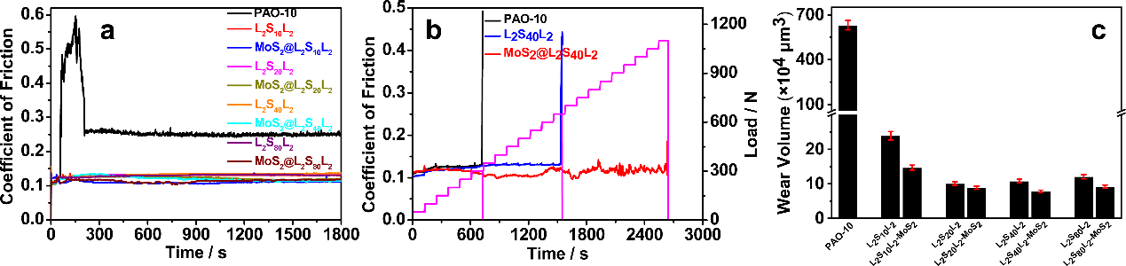图三、(a)PAO-10、LmS2nLm和MoS2@LmS2nLm(2n = 10, 20, 40, 80; m = 2)油凝胶的摩擦曲线。(b)PAO-10、L2S40L2和MoS2@L2S40L2的摩擦系数随着载荷增加的变化曲线。(c)由PAO-10、LmS2nLm和MoS2@LmS2nLm(2n = 10, 20, 40, 80; m = 2)油凝胶润滑过的钢块表面磨损体积。测试条件:载荷为400 N,振荡频率为25 Hz,振幅为1 mm。