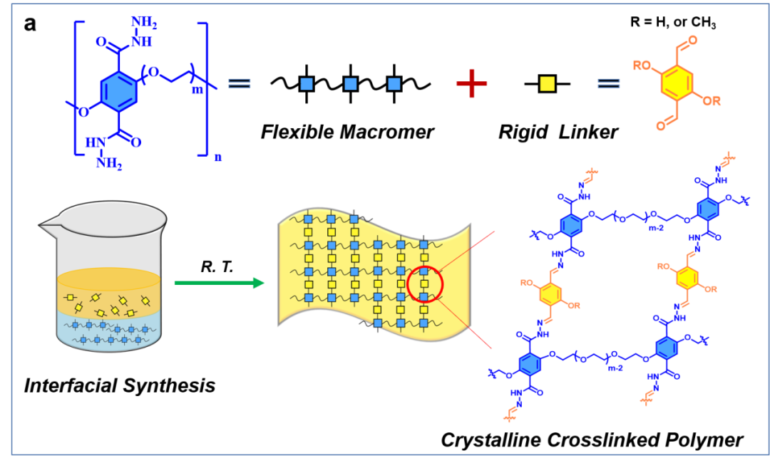 南开大学化学学院张振杰课题组长期聚焦晶态智能聚合物的理性设计与可控合成,并针对晶态聚合物力学性能差、难以加工成型等难题,开发了一系列化学和物理改性策略,突破了其高性能化加工的瓶颈。近期,张振杰课题组研究团队设计合成了聚乙二醇(PEG)桥连的柔性低聚物作为“大分子单体”,进而与刚性小分子连接器通过共价键进行有序组装,原位成型制备了一系列自支撑的新型晶态交联聚合物(CCPs)膜。该材料在溶剂蒸气刺激下可进行可逆的弯曲机械响应。这项工作首次实现了高结晶度交联聚合物的可控合成,并拓展了晶态聚合物网络的结构类型。